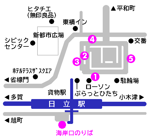 | 海岸口のりば | 茨城交通 …神峰営業所(市役所交通広場経由)、多賀駅(海岸線経由) |